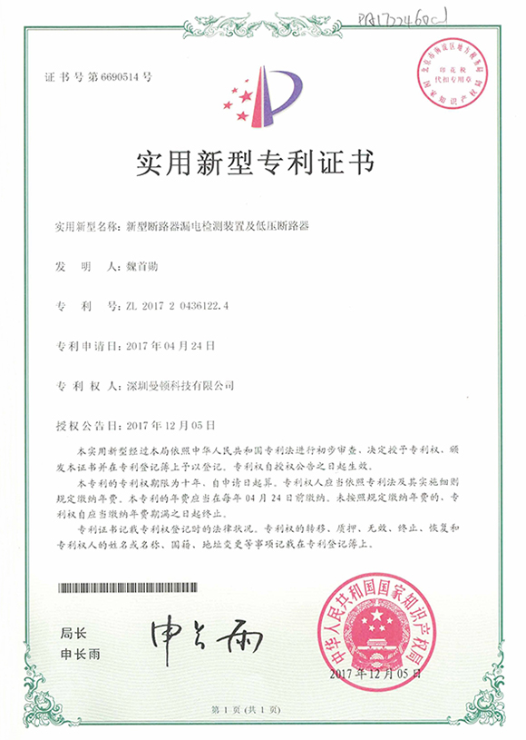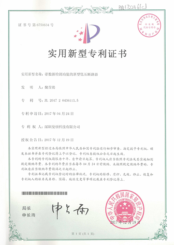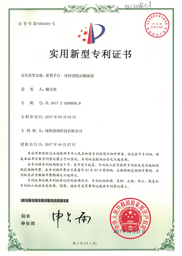 ʵÓÃÐÂÐÍ-ÐÂÐÍÊÖ×ÔÒ»Ìå¿ØÖÆµÍѹ¶Ï·Æ÷Ö¤Êé