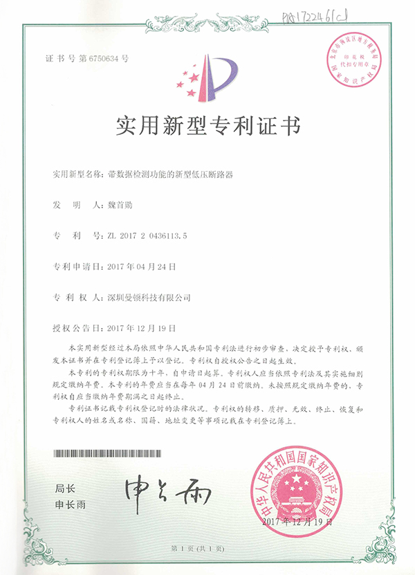ʵÓÃÐÂÐÍ-´øÊý¾Ý¼ì²â¹¦Ð§µÄÐÂÐ͵Íѹ¶Ï·Æ÷Ö¤Êé